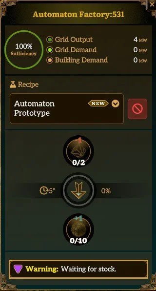 This becomes problematic because the game has inventories for each building, the player’s backpack, as well as the main HQ and even the factories as hoppers for raw resources and finished products can be held in the factories. As seen below, the Automaton Factory will have the hopper that says that for 2 raw compute cores, it can produce an automaton and can hold 10 of the completed products.
